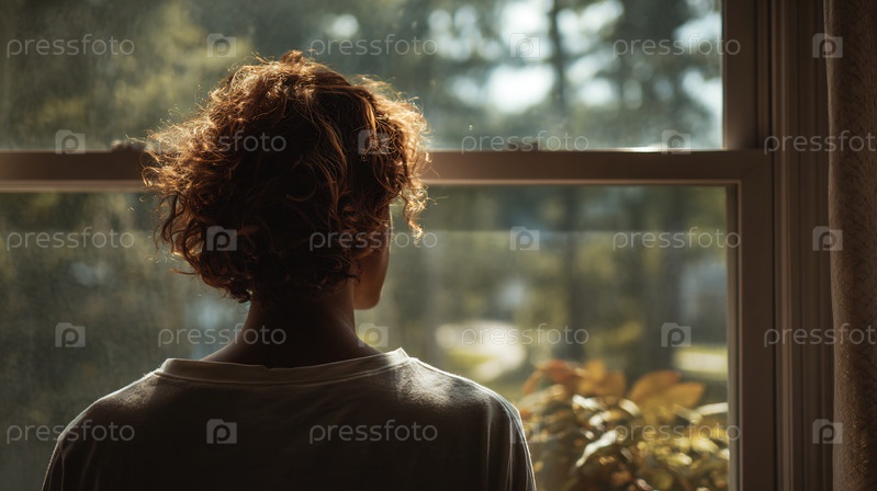 Задний вид молодой женщины с кудрявыми волосами, тихо заглядывающей в окно
