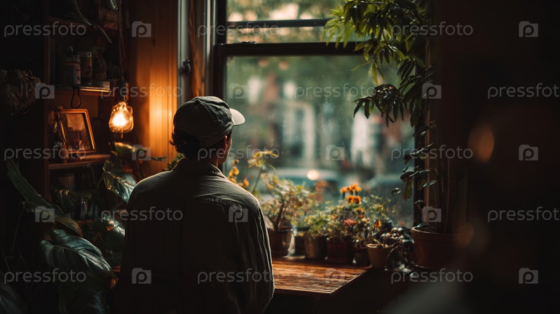 Человек в шляпе смотрит в окно из уютной комнаты, окруженной растениями