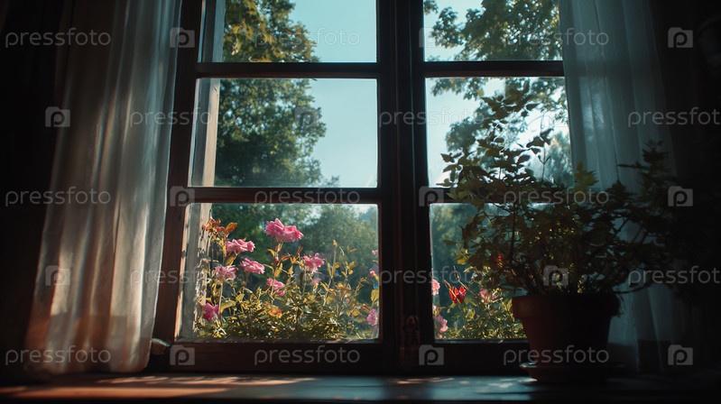 Теплый солнечный свет освещает окно розовыми розами, зелеными деревьями и комнатными растениями