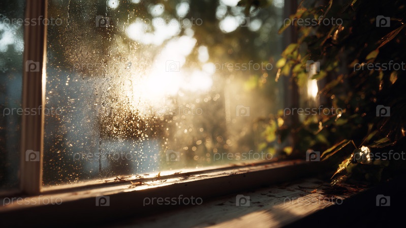 Дождь падает на старое окно с мягким золотистым солнечным светом, вид на природу снаружи
