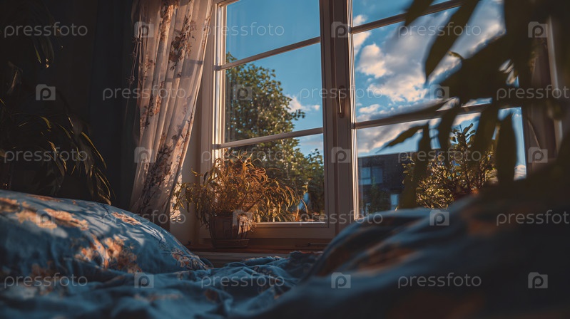 Уютный интерьер спальни с солнечным светом, проходящим через окно, растениями освещения и удобной кроватью