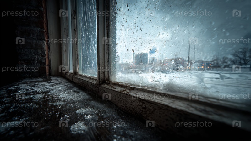 Капли дождя на старых стеклах окон, глядя на заснеженный городской пейзаж в мрачный зимний день