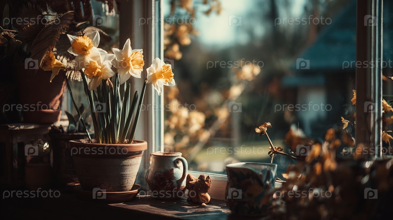 Свежие весенние нарциссы цветут в терракотовом горшке у солнечного окна, с размытым внешним фоном