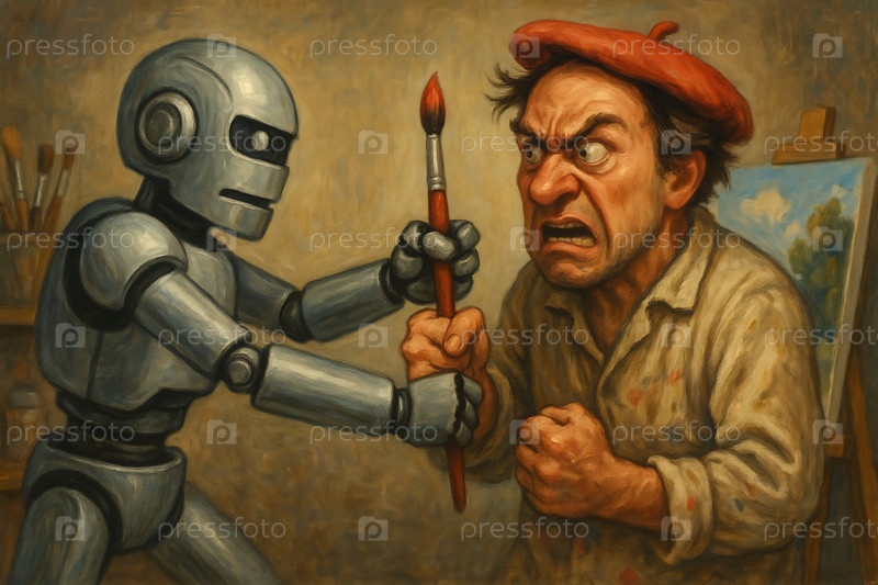 ИИ-робот берет щетку и работу художника. Художник злится, расстроен и напуган. Они находятся в домашней художественной студии