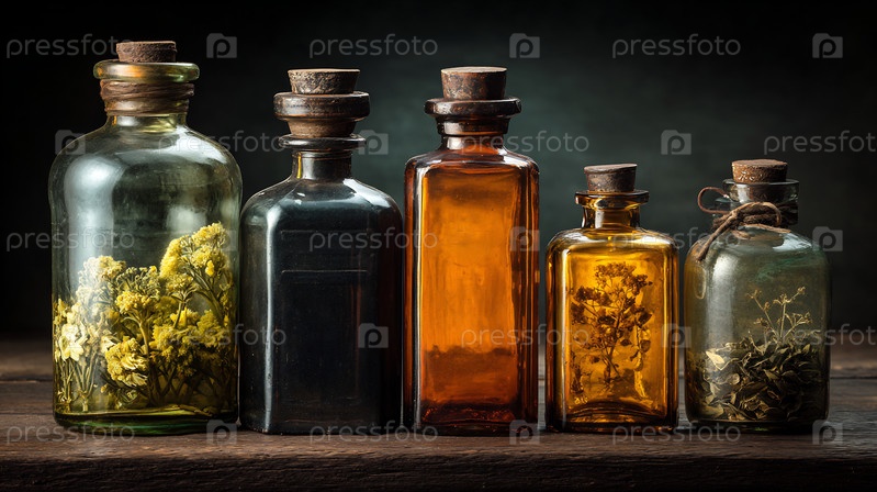 Диапазон винтажных стеклянных бутылок, некоторые из которых содержат сушеные ботанические элементы