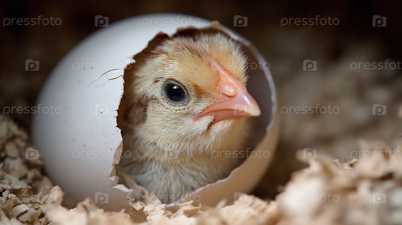 Роскошная новорожденная курица вылупляется из трещины белого яйца в постельном белье