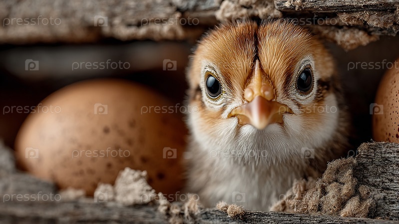 Близкий план очаровательного цыпленка в деревянном деревенском гнезде с яйцами