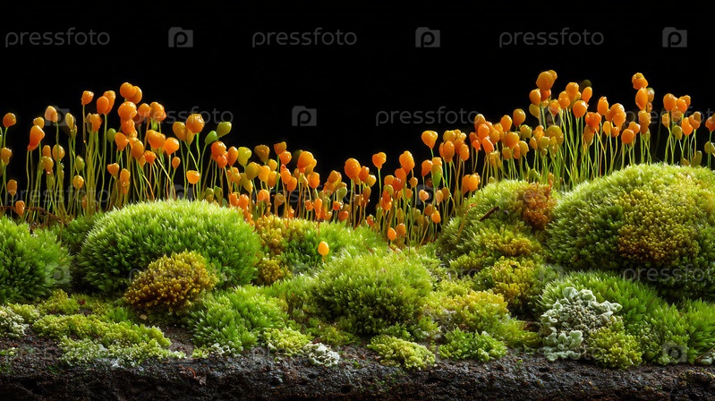 Близкий план пышного зеленого моха и оранжевых капсул споров на тёмном фоне