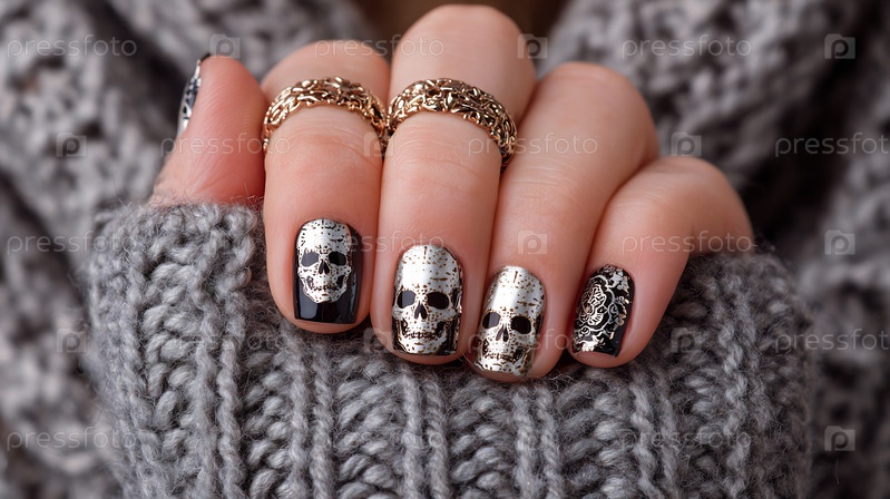 Стильные черепа и орнаментированные узоры на женских ногтях.Золотые кольца и серый свитер видны