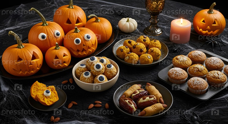 Печенье в стиле Хэллоуина и тыква, глазные яблоки и фонарик Jack-o