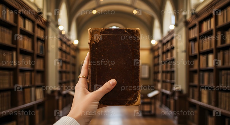 Рука женщины держит старую книгу в библиотеке