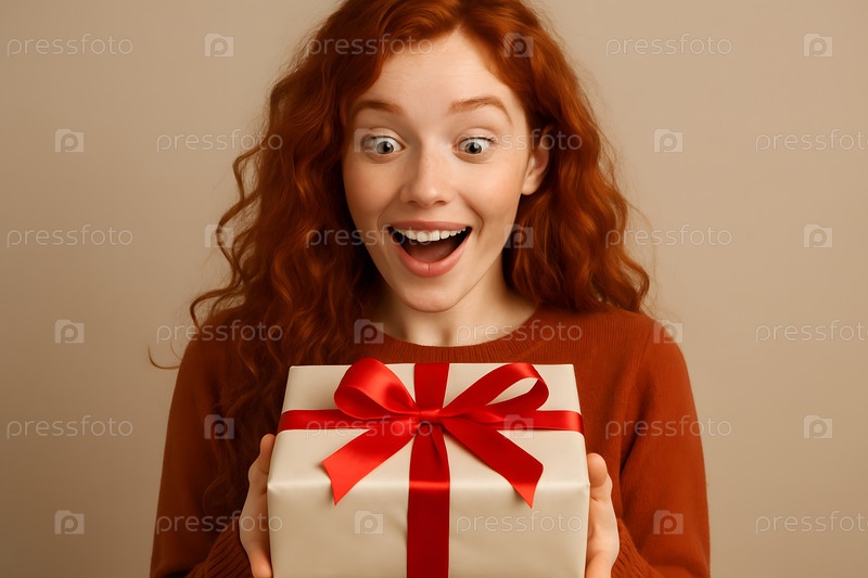 Удивленная девушка с оранжевыми волосами держит белую подарочную коробку с красной лентой