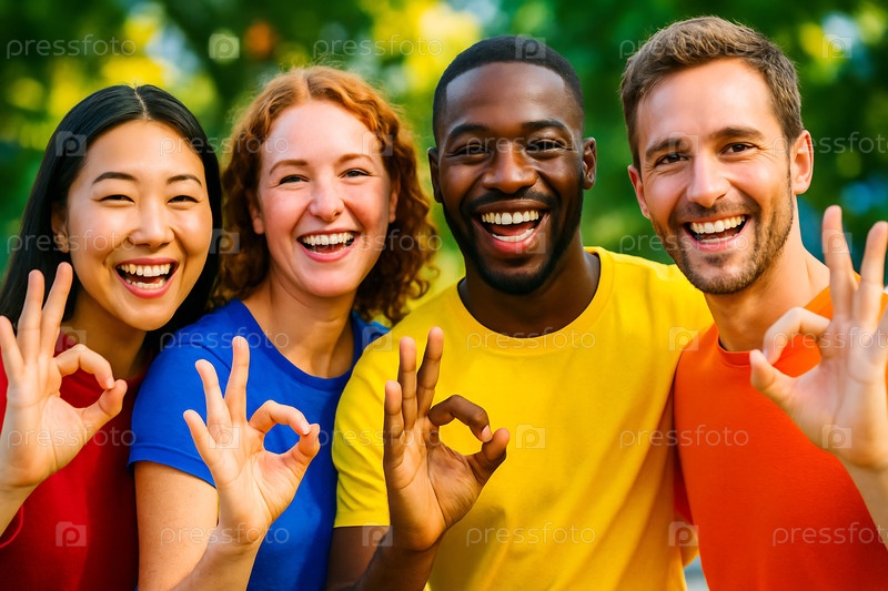 Счастливые люди показывают хорошие признаки.Азиатские, чернокожие и белые представлены