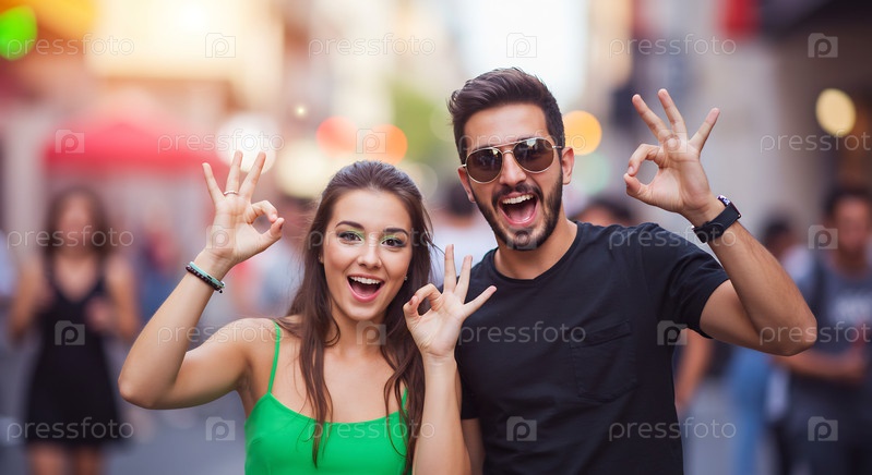 Счастливая стильная современная пара, показывающая знак 'ОК' на оживленной улице в современном городе. Мужчина в солнцезащитных очках. Парень с бородой. Девушка со зелёными веками