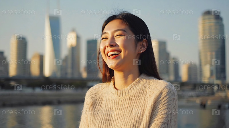 Счастливая азиатская девушка в белом свитере в холодном, пустом городском городе
