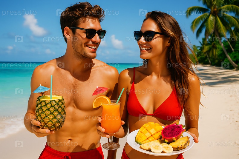 Счастливая пара на тропическом пляже, ест тропические фрукты