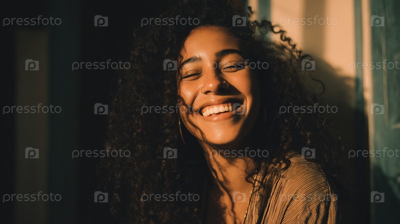 Счастливая молодая женщина с кудрявыми волосами улыбается, глаза закрыты, освещена теплым светом