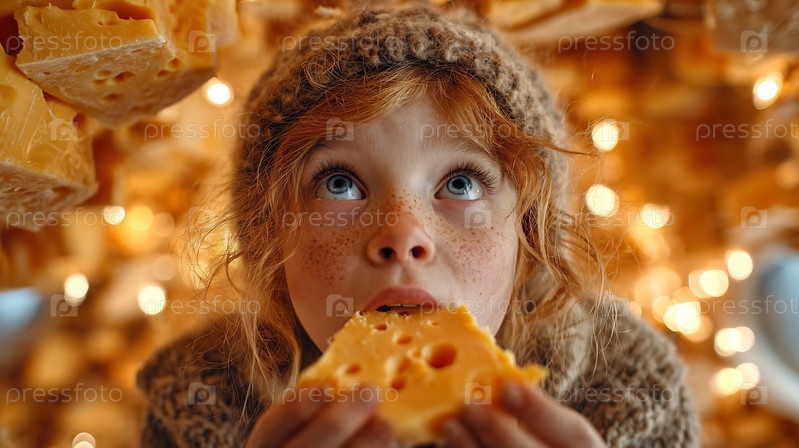 Красноволосый ребенок ест сыр в окружении плавающих кусочков сыра и теплых огней
