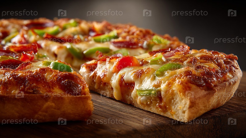 Горячая пицца на кусочки сыра с пеперони и зеленым перцем, подается на деревянной доске