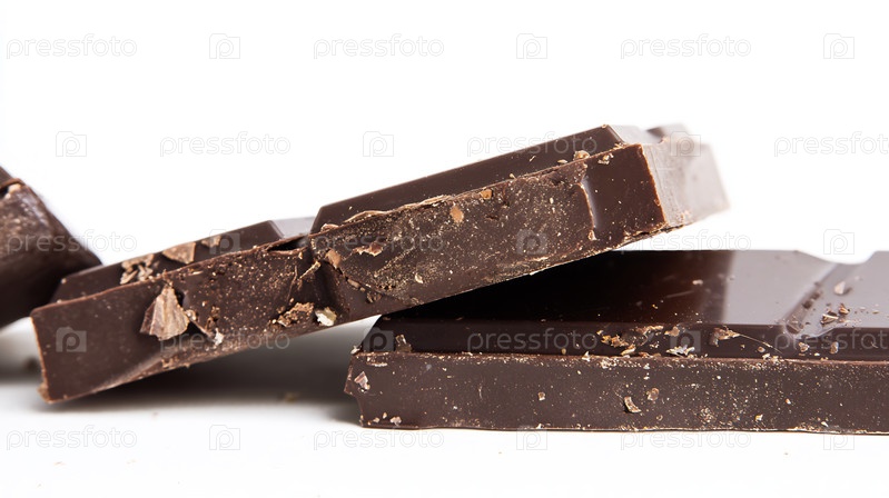 Куски темного шоколада на белом фоне