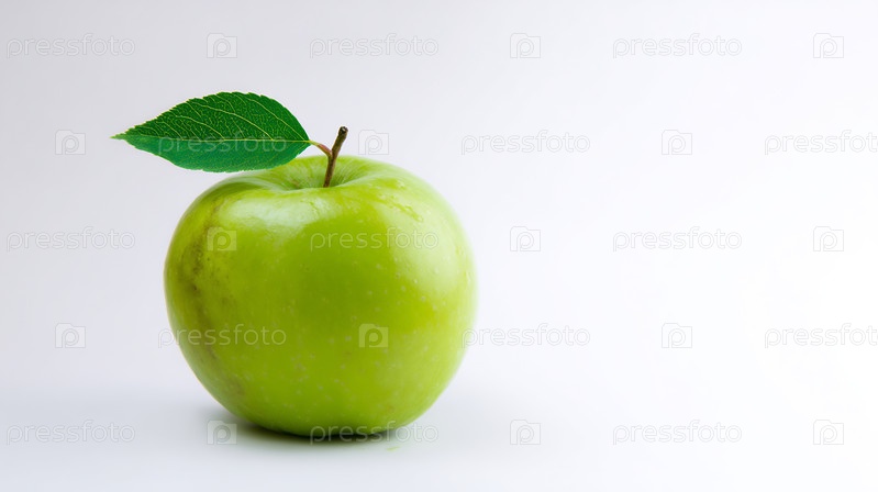 Свежее зеленое яблоко со стеблем и листьями