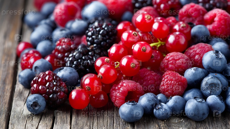 Закрытие свежих смешанных ягод на деревянной поверхности села.Здоровые, вкусные фрукты
