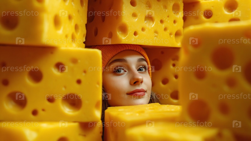 Лицо молодой женщины, заглядывающей в большую кучу желтых блоков сыра
