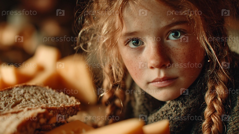 Портрет серьезной рыжеволосой девушки с косичками, окруженными хлебом и сыром