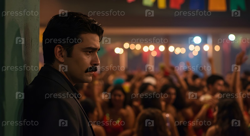 Красивый одинокий мужчина с усами стоит рядом со стеной в дискотеке