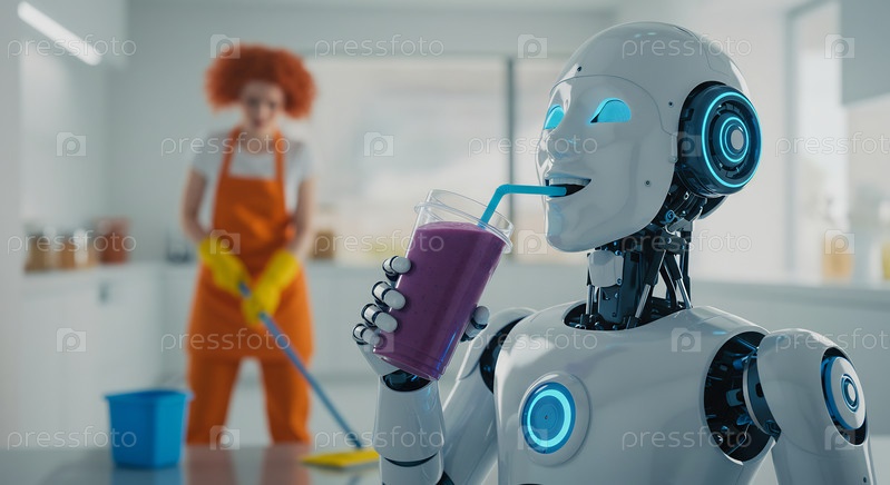 Робот пьет коктейль, а женщина убирает пол.Счастливый высокомерный андроид улыбается и отдыхает в то время как человек усердно работает