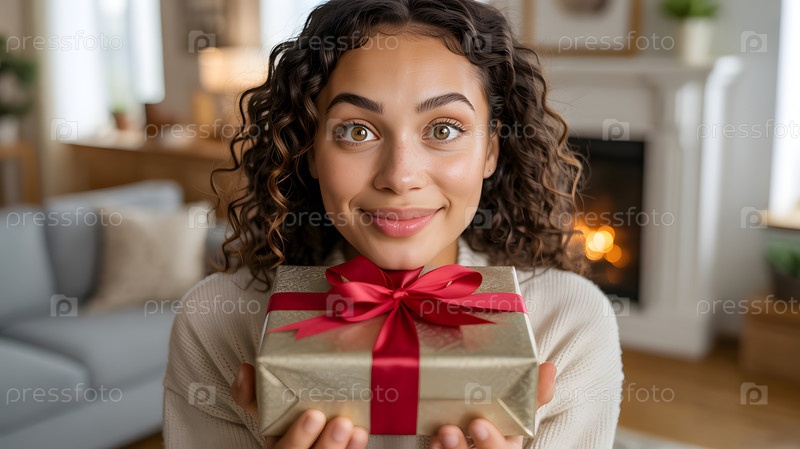 Коричневоглазая девушка с белой подарочной коробкой с красной лентой смотрит в камеру