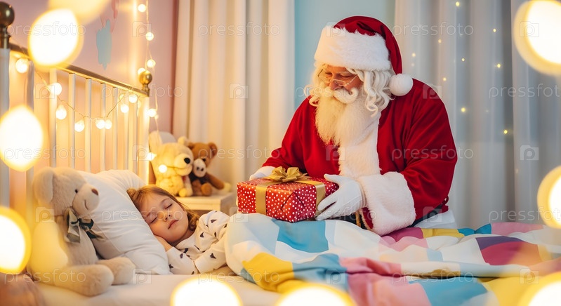 Санта Клаус дарит мальчику картонную подарочную коробку с красной лентой в канун Рождества