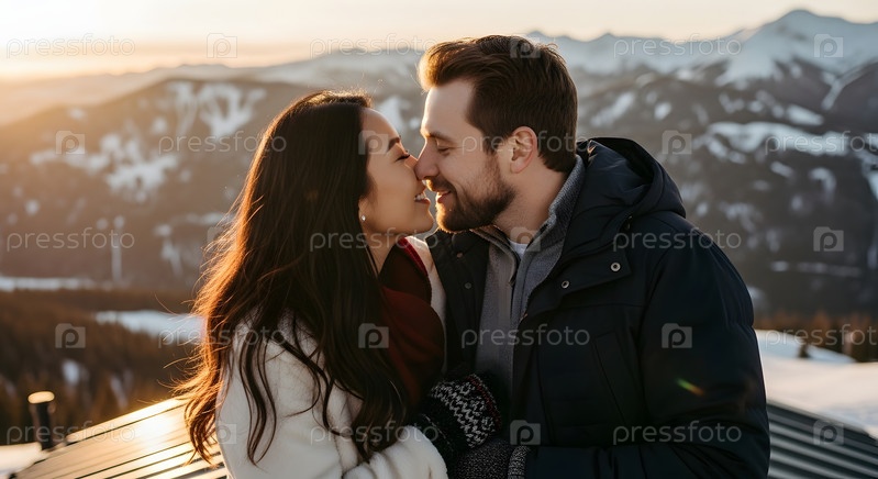 Азиатская женщина и белый мужчина целуются на вершине горы зимой