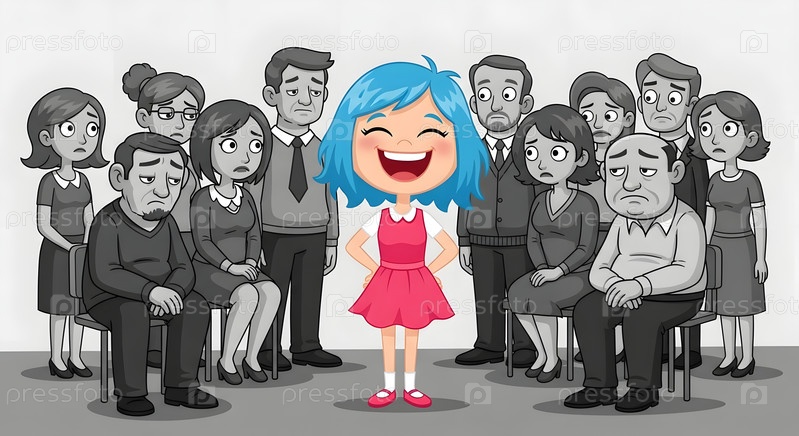 Счастливая красочная девушка с голубыми волосами улыбается посреди серой печали обычных людей
