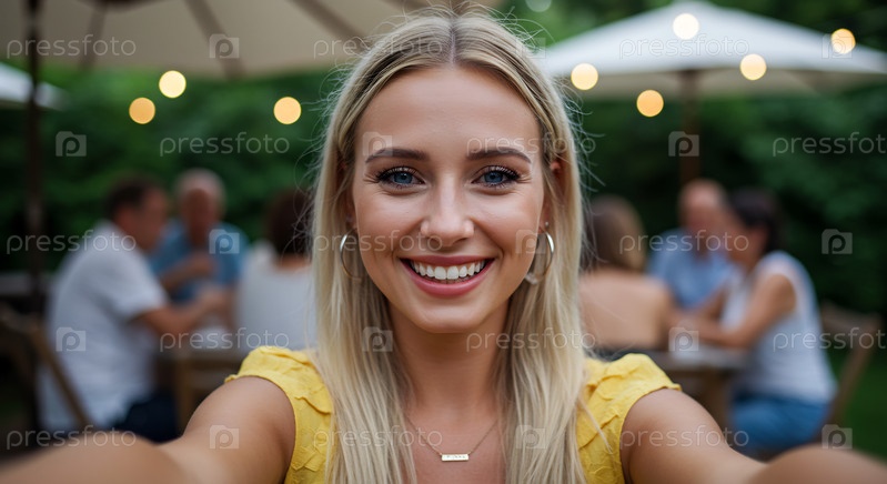 Веселая молодая женщина делает селфи во время уличной встречи с друзьями или семьей