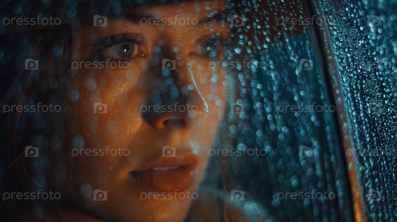 Вдумчивая женщина смотрит в окно, размытое капельками дождя и теплым светом