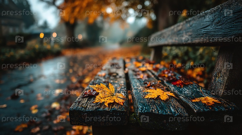 Осенние листья украшают влажную, деревенскую скамейку парка в спокойной обстановке