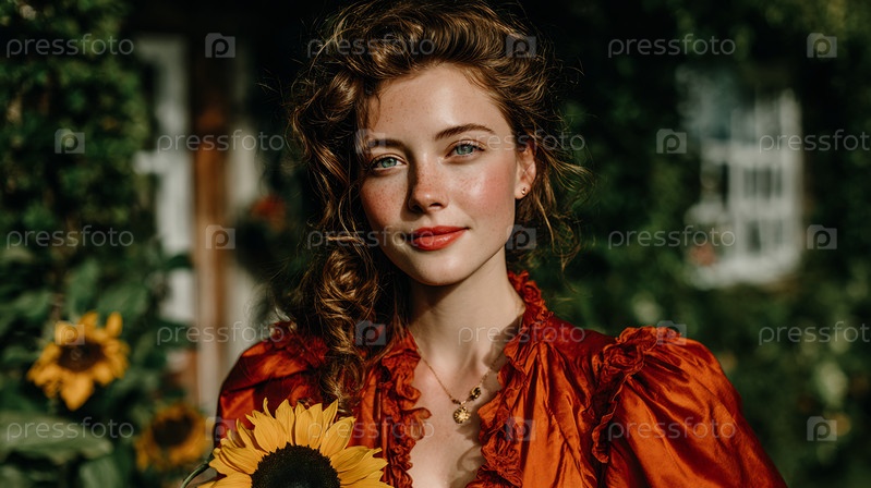 Красивая молодая женщина с кудрявыми волосами и веснушками держит яркий подсолнечник