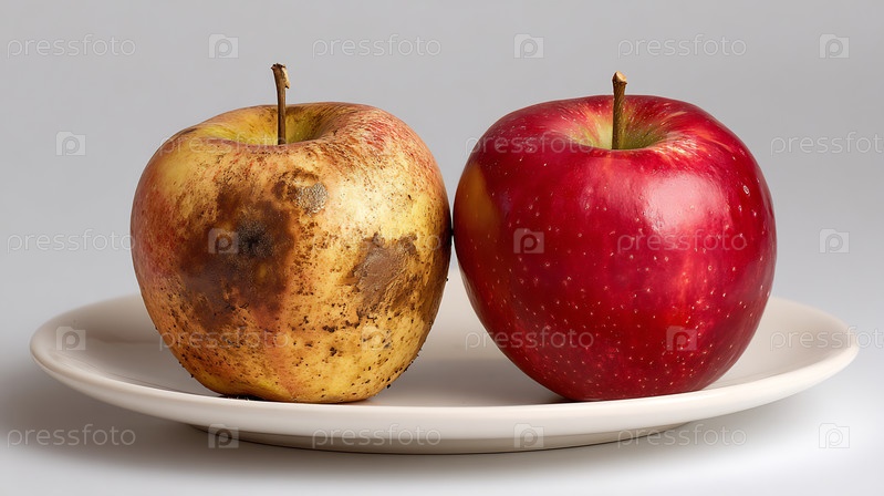 Здоровое красное яблоко контрастирует с гниющим, прогнившим яблоком на белом блюде