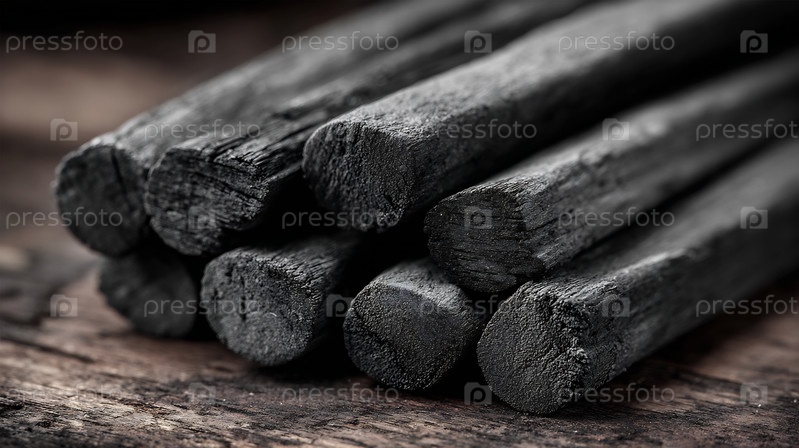 Естественный черный бенхотановый уголь прилипает к древесине, используемой для чистки, приготовления пищи