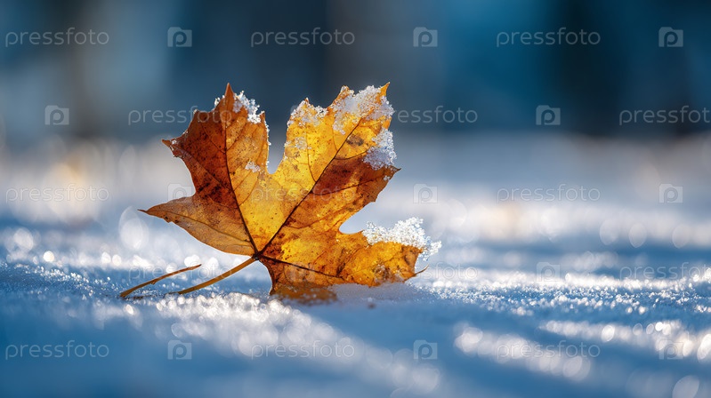 Близкий план золотых осенних листьев на блестящем белом снегу