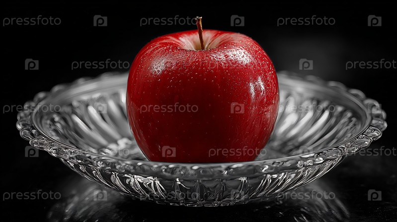 Свежее красное яблоко с каплями воды в стеклянной таре