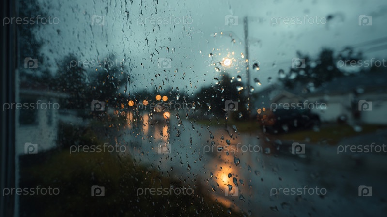 Вид на темную улицу через мокрое окно с теплыми огнями боке