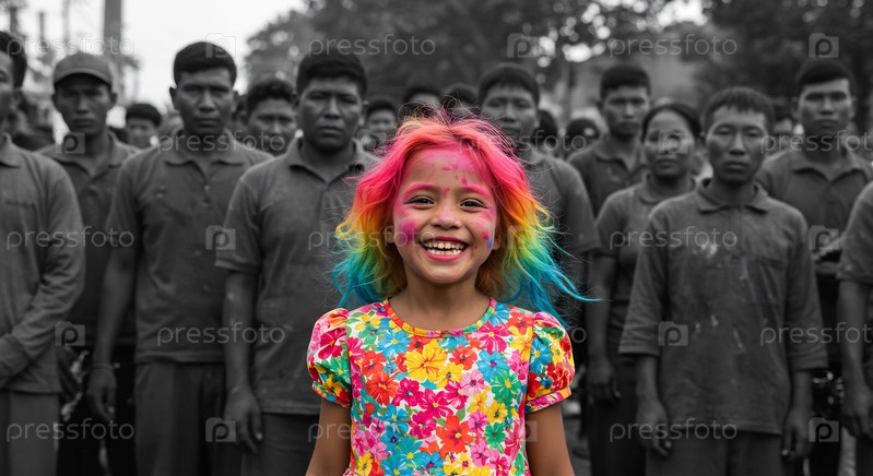 Красочная девушка с цветными волосами, окруженная седыми людьми