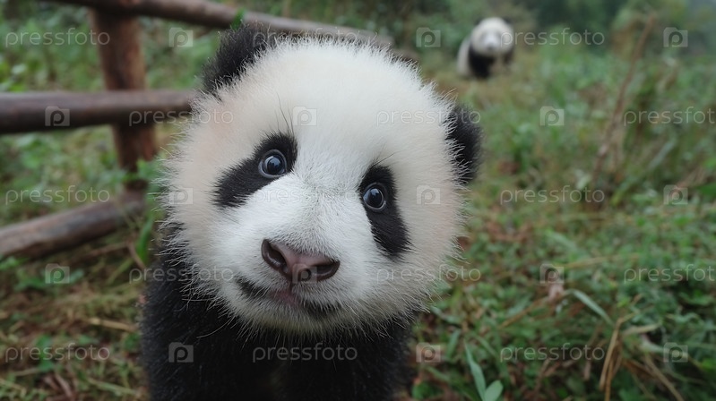 Милый детеныш гигантской панды смотрит вблизи на камеру в своей среде обитания