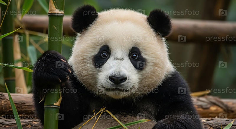 Очаровательная гигантская панда пристально смотрит, держа бамбуковый стебель в природе