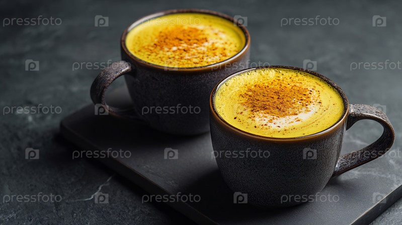 Две чашки здорового золотистого куркумного молока на фоне темной текстуры