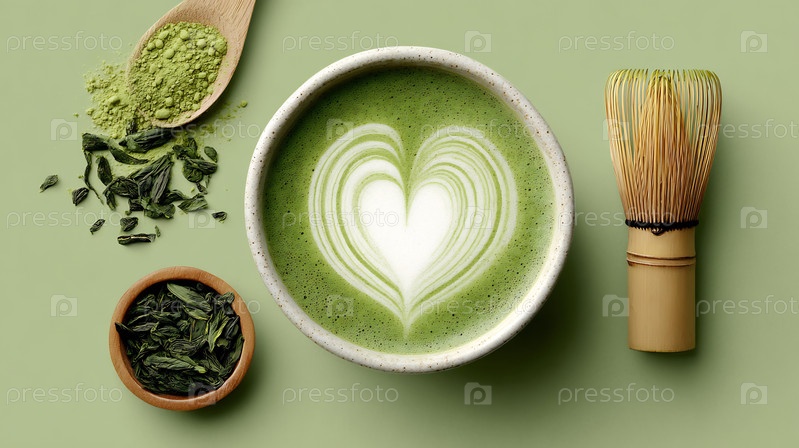 Зеленый мача-латте в чашке с искусством лате в форме сердца, наряду с ингредиентами для чая и виски