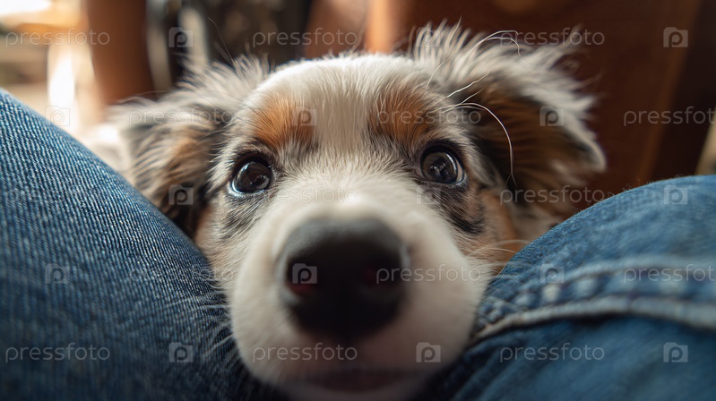 Любопытное щенко смотрит вверх большими глазами, заглядывая между его джинсовых ног