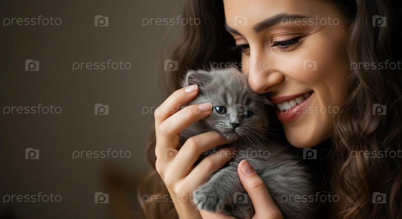 Красивая молодая женщина улыбается, нежно держащая волосатого серого котенка
